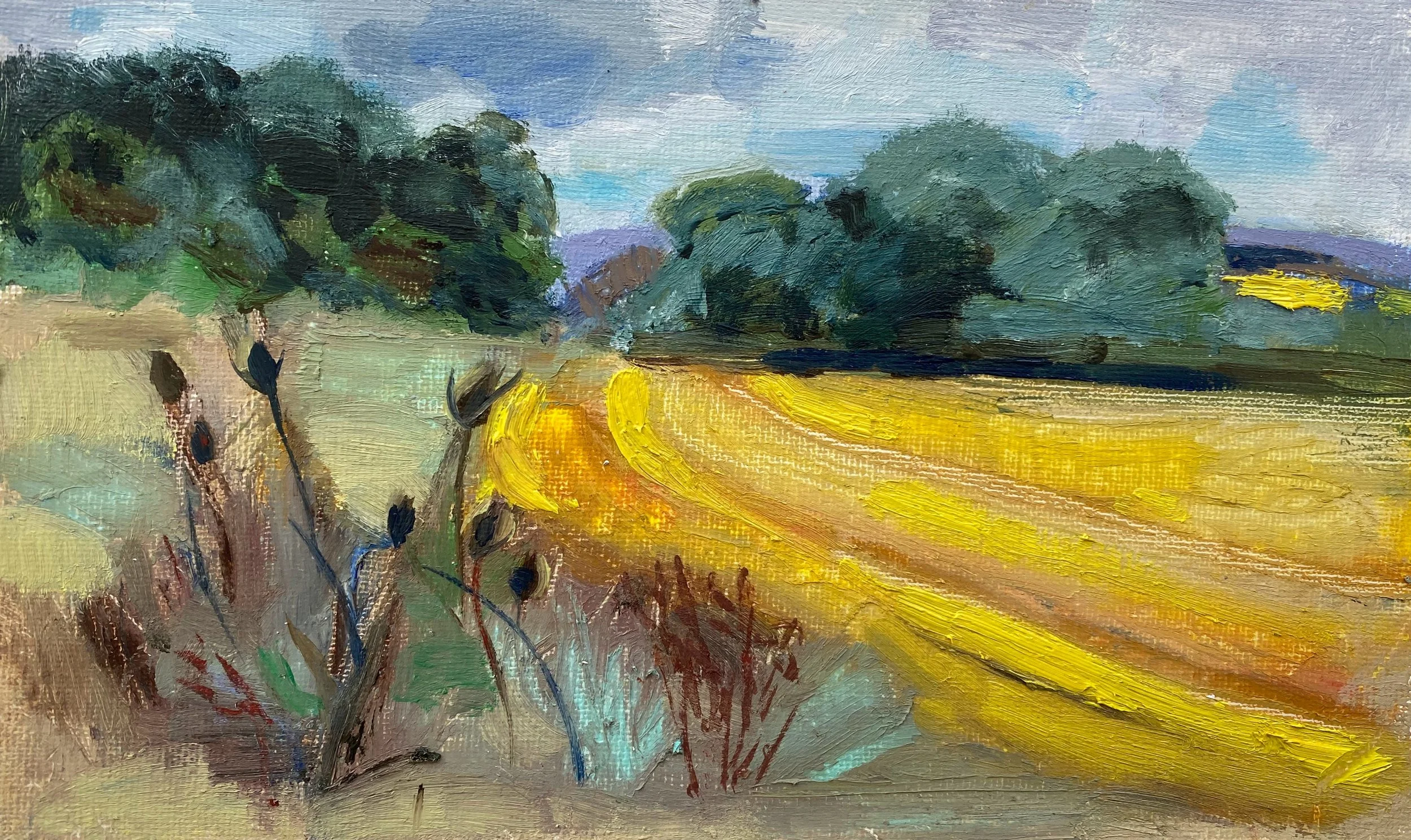 Harvest Time Selmeston 1 (oil on prepared paper 25 x 14 cm)